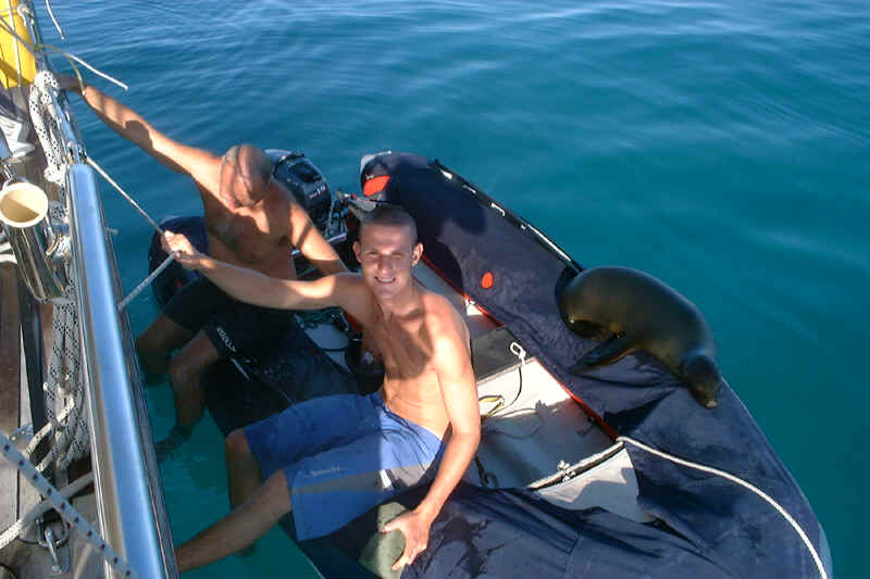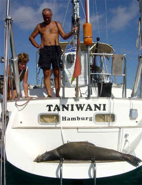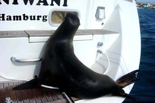 Off course, life on TANIWANI is not quite as easy going as that of the sea lions, and once in a while TANIWANI needs a cleaning job on the topsides. Here was a good and quiet place for work of this kind and nice helpers to balance the dinghy. This way and in such a nice place, waiting for the cruising permit was not so hard. Johnny had said that he might get the permit by Saturday, (we arrived Monday), so that by Saturday we had also topped up fuel and were ready to go to Porto Ayora, where Johnny has his main office and where we could get the required guide and the permit to visit the national park areas.