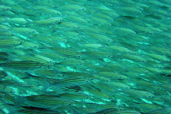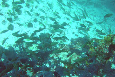 fish of all sorts. The seven big sharks look scary but they seem to not bother.