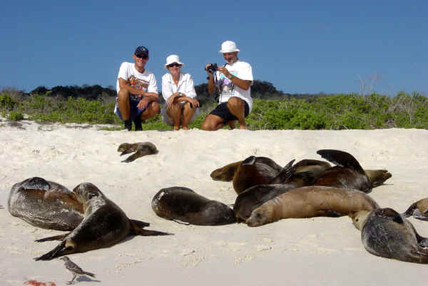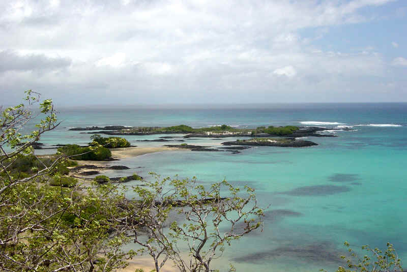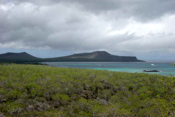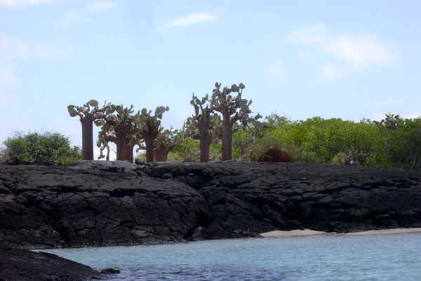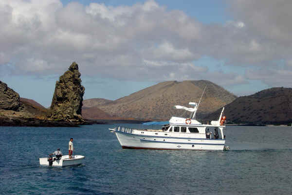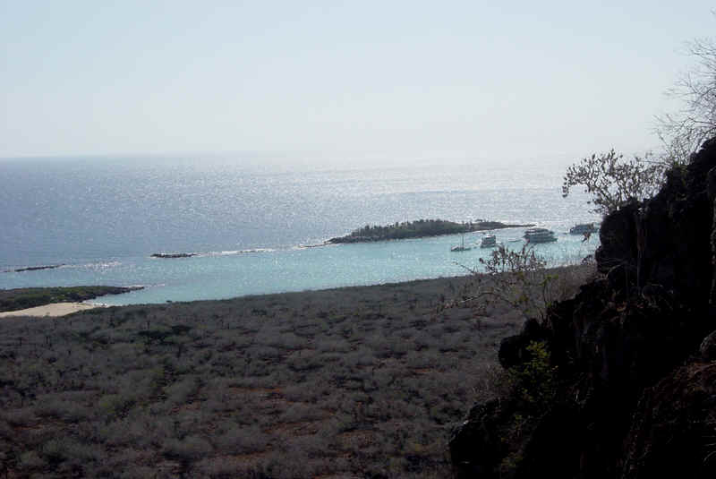 for such a trip on Tuesday. But 5:30 in the morning we hear: "TANIWANI, TANIWANI, are you awake??" - "Yes, sort of??" It was Wolfgang from WETNOSE who told us that there were two no-shows and that the tour operator would take us along if we can make it in ten minutes. Trained as we are for abandoning ship emergencies, we certainly could, and soon we were sitting in a brand new and clean bus, driving out of Puerto Ayora. An hour later we boarded the old, little tour boat "Santa Fee 2", which immediately weighed anchor and started steaming (black smog), full throttle ( 7 knots), towards the Island of San Salvador, about 4 hours away. We were served a nice breakfast and then tried to find some shade to wait for our arrival at Bartholomew. Santa Fee's dinghy unloads all their passengers in two short rides to the shore of the little island of Bartholomew. A nice trail leads up to the top where we have one of the most magnificent views in the islands. After that snorkeling along the beach below is on the program and we get our money worth on animals to see in the water. First a shark, (Beate's first encounter), then one of the famous penguins and finally a large turtle. Again a quite nice lunch on board and then a long steam back to Santa Cruz. It was a very nice excursion, but also a long day and we conclude it with a late dinner in town.