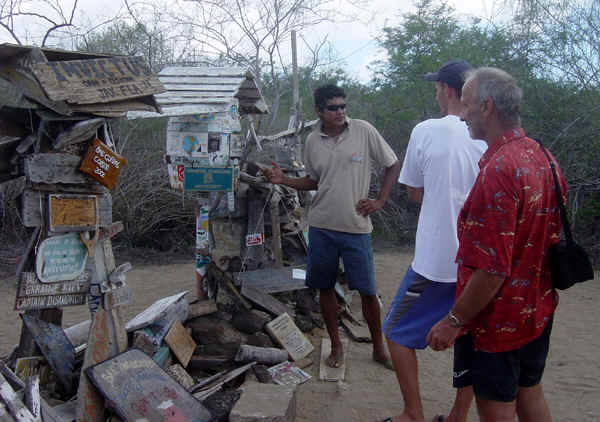 our guide at six in the morning at the dock and then head off. Marlon, a biology student turns out a great guy and a big asset. He is as excited, as he has never guided a private yacht, rather jobbed for many of the local tour operators. He fits right into the small Taniwani crew and we thoroughly enjoy his company for four unforgettable days. Ahead of our tour we had to decide on a rigid itinerary that has to be approved by the park authority. Luckily Johnny had done this before for many of the big private mega-yachts and knew what they liked. So right after picking up Marlon, we weighed anchor and headed south to the island of Floreana, (in some charts called Santa Maria). As usual in this archipelago there was not a lot of wind and we had to motor sail. We also decided to burn fuel and go fast for a change. That way we moved at 8.8 knots and were able to drop our anchor at the famous post box bay at 10:20 am. Three tour boats were