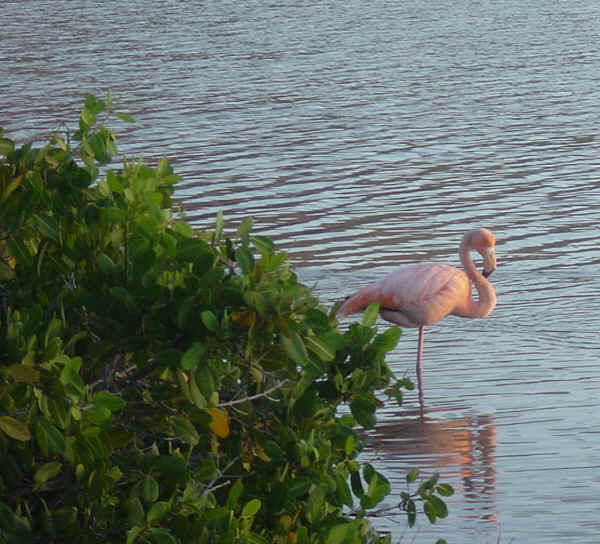 lagoon. Pink flamingos close by and many other birds in the bushes, so close you