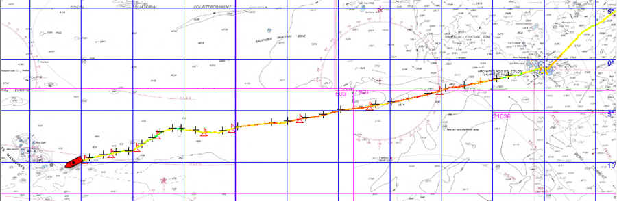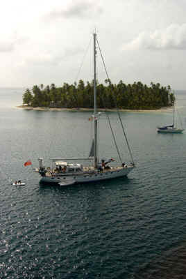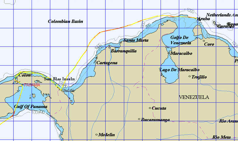 | 2nd Report 2005: San Blas Islands, Panama and Galapagos Islands Our last update came from Aruba and much has happened since. In the chart below you can see our track from Aruba to Obaldia. All along the Columbian coast, but in respectful distance. It took us exactly 3 days to cover the 550 miles and it was boisterous sailing in strong trades, at least for the first two days. In the chart, where the track is shown in red, Taniwani was sailing at more than 9 knots. Beate had the peak reading on the speedo in the second night when it showed 14.6 knots. As typical and expected the wind died some 30 miles before our destination.