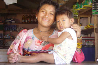 We inspect the new place and soon meet Pablo who has worked in England for many years and speaks quite good English. He is trying to entertain some very basic tourism, has a ' hotel' with one room and a restaurant where you may have dinner if you tell them in advance and if they have enough supplies. We pay the usual visit to the Congreso and the Chief, check out the village and buy Molas and bread.