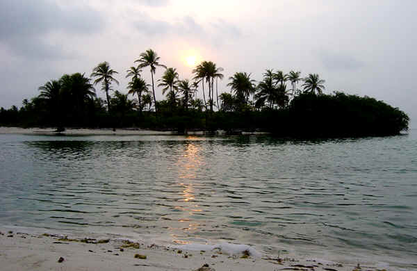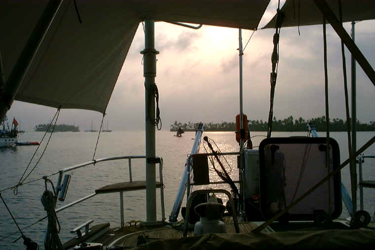 It takes some time for us to work through all the red tape, but it is also entertaining: Lacking the appropriate forms, the harbor-master creates them by writing on the letterhead paper of the marine office. Works fine, but takes time. The immigration officer asks us to wait a few minutes so he can clear two international flights?! We follow him to see what is going on and come to a soccer field on the beach. The goals have been moved and there are two 20 seat planes nicely parked, Kuna people in tears saying goodbye to their loved ones and eventually the first plane starts the engines, taxies behind a row of houses and them comes roaring out the small alley, across the soccer field and off into the air. Later we learn that some flights come from Columbia with a short stop here and then on to Panama City. A flight to Panama City costs just $47 and they go every day. Aside of slow coastal boats, this is the only connection; there are no roads to most parts of Panama. Obaldia seemed like a nice place, but we thought the anchorage might be a bit too open to the swell and we also were keen to get into the island world of the San Blas'. And so we moved on as soon as all the officials were happy. It was only some 25 miles to Caledonia, but moving through shallow and uncharted water made it seem longer. For many miles offshore, the sea is shallow at around 30 meters and just once in a while our graphic sounder showed a steep incline and we quickly slowed the boat: 15 meters, 10 meters, 7 meters..., we would hold our breath, but then it got deeper again. This sort of excitement we had several times while cruising in these islands. Just before reaching Caledonia we caught a large barracuda and worried about ciguatera poisoning we headed for a small canoe with a very primitive sail and an old man with his very young son or grandson. We gave them the fish and you should have seen the smiles we earned. Caledonia turned out a really beautiful place. A pool fringed by little islands, so calm inside that we thought our boat was on land, not in the water. And so quiet too, absolutely no noise to be heard all night.