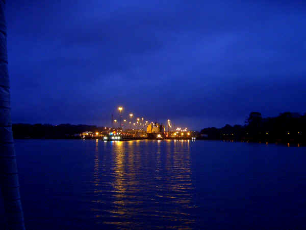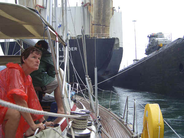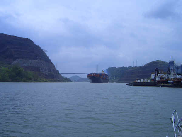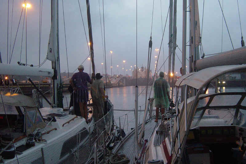 Now we are ready: Renee stays overnight on board and the other two line-handlers get picked up at 3:30 in the morning! Well, we were told to call the control tower at 4:00 in the morning to get advice and they tell us that the pilots are on their way. We are three boats: Wetnose, 3t ( a Norwegian Nicholson 60 ) and Taniwani, the smallest boat. Wetnose has hired two professional line handlers and has Inga and John from Pearl on board in addition. The "Pearl Family" now plans to leave their boat in Colon and sail on Wetnose to the Galapagos, spend two weeks there and then fly back to their own nice boat. Soon the pilot boat shows up and heads towards our lights and at 4:20 David, our pilot jumps on board: "Are we still anchored?" "Yes." "Ok, you can bring the anchor up and proceed to the entrance channel; where can I change?" And so we are off and move through the dark towards the blinking lights of the main shipping channel. The other two boats now also have their pilots and follow us. A mile or so before reaching the brightly illuminated Gatun Locks, David asks us to slow down and wait for a cargo ship to overtake us. It is supposed to be with us in the same lock and when locking up, the big ships always go in front. Soon a huge wall of steel passes close by and then we see the name on the stern high up: Pioneer Leader. As we follow and approach the locks, the rain starts pouring down - David says that's normal here.