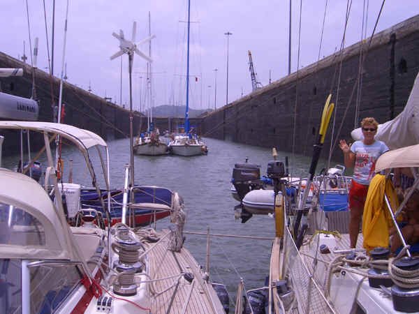 for the total 26 meters to the Gatun Lake. We have plenty of space behind the freighter and could have easily secured every of the three yachts separately in the center line. David our pilot explained that they don't do this because it is too expensive to have that many people tending the lines on the shore. And the canal company may well loose money on transiting yachts anyway. A big freighter like the one in front of us has to pay about $70,000.- for the transit, while we pay just $850.- The water streaming into the locks causes some turbulences and to prevent the boats from drifting around in this, the lines need to be kept tensioned. In our case this is done on Taniwani with its powerful electric winches and the lines on Wetnose remain fixed; With the other heavy boats attached, Wetnose alone displaces over 50 tons, there is a lot of tension on the lines and it would be impossible to pull them by hand.