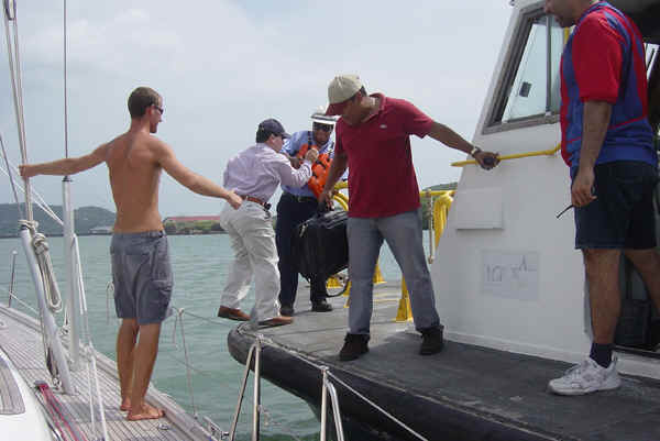 David our very skilled and very nice pilot is supervising the whole process and quietly gives commands to the line handlers. He is very concentrated and watches out that none of the somewhat inexperienced volunteers gets accidentally hurt. As always, Taniwani seems to attract fine people, and it isn't different with our pilot: While he usually takes big freighters through the canal, he turns out expert in small boat handling and concerns and he does it all in a very gentle way; most maneuvers start with him saying to the skipper: "Is it ok with you if we do this this way?" It certainly is.