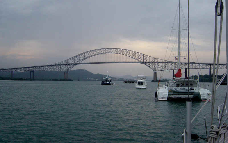 The Miraflores Locks are again a double stage where we complete our descent to the Pacific. There is a webcam at Miraflores and we had informed our friends of our transit time, so some may be watching our slow progress through the two locks. Unfortunately, as David explains, it is a Sunday and then the camera is on a fixed wide angle setting, whereas on regular work days somebody may have it point at the individual boats. Soon we are down at the level of the Pacific and the huge doors to a new ocean swing open. On the short last leg to Balboa, just before we pass under the beautiful Bridge of the Americas, a pilot boat catches up with us and David jumps over. For a moment it looks like after we managed the canal without damage we will now incur one, as the pilot boat gets entangled in our guardrail for a moment. But it's all fine and we complete the transit by passing under the nice bridge and picking up a mooring buoy at the Balboa Yacht Club. We only spend a few days