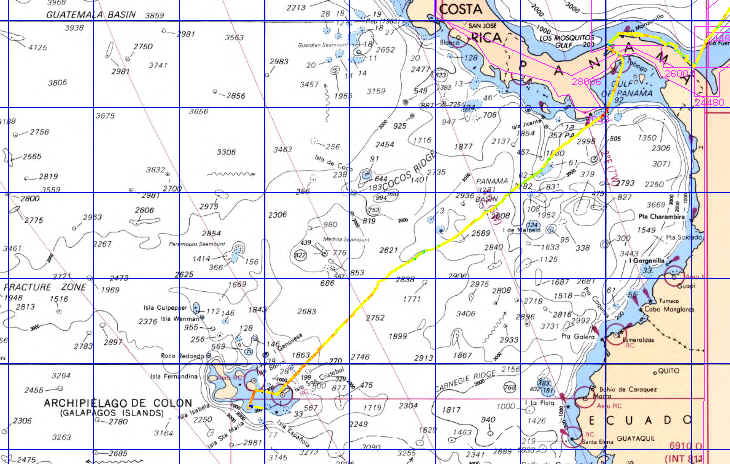 The route to the Galapagos Islands usually crosses the doldrums and is known for lacking wind. The distance is just 890 miles so that in theory we could motor the whole passage. But that is not what we like to do. There is no wind when we leave Balboa, but as we head towards Punta Mala to get out of the Golf of Panama, some light wind comes up and we set the Spinnaker and take off nicely. Soon the wind gets even too much for the Spi and we continue with the Genoa into the evening. Nearing Punta Mala we suddenly receive a MAYDAY call on VHF. It is from another sailboat called ESCAPADE on her way down the coast to Balboa. Another boat answers the call so we wait. But after a while ESCAPADE repeats its MAYDAY and we hear no other boat and answer the call. ESCAPADE is taking water for a while and their batteries are getting weak and they think they cannot cope with the water ingress for a longer time. They say that they had no wind and that they were drifting with broken engine and the leak now for four days and that we were the first to answer the MAYDAY. We think this is strange as we are only 26 miles off their position and have good wind. Also Punta Mala is a very frequented spot with a lot of big shipping traffic to and from the canal. We change course slightly and go for their position. We also send out a MAYDAY-relay, which is received by several other yachts who now also aim for the position. WETNOSE behind us picks up our call, and calls the Rescue Center in Bremen, who in turn notify the U.S. Coast Guard. We tried to reach the Panama Coast Guard on all possible frequencies to no avail. But in the mean time the Mayday is broadcast via satellite and two of the large freighters in the vicinity get involved. The closest ship seems a 60ft Nordhaven trawler who connects with ESCAPADE and should be in their position in less than an hour. The name of the trawler is Starweather and the skipper handles the matter very professionally, eventually picking the couple of their boat, leaving ESCAPADE adrift. - We all go back to our courses. Then wind gets weaker