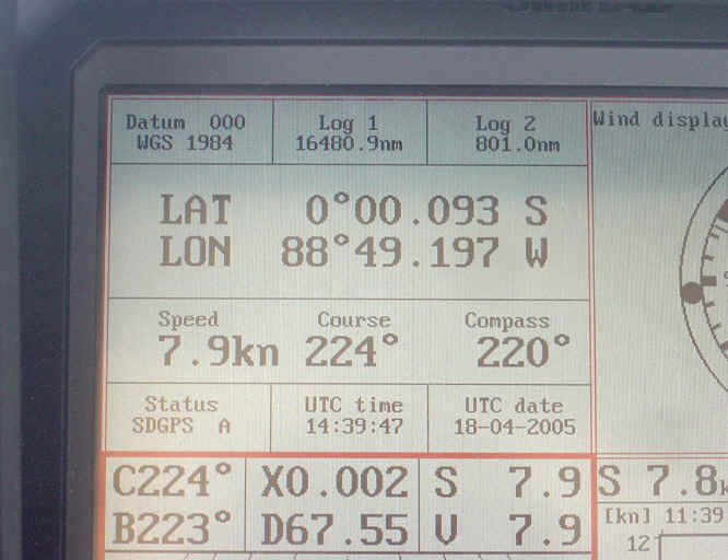 One night we appear to sail close to two of those suspect vessels and we make a drastic course change and steer completely clear of them to err on the safe side. The winds remain weak for most of the passage and rain squalls are now a standard feature. We motor-sail several days until about a day and a half from the Galapagos we finally get some decent wind. With that we overtake Wetnose again and a day later we cross the Equator.