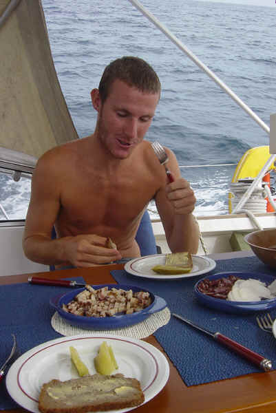 At the beginning we have good wind and soon TANIWANI is gliding along towards the Island of Santa Cruz at 8 knots. Johnny, who usually travels on noisy motor driven boats is astonished about the quiet elegance of sailing. Unfortunately this doesn't last the whole way and at some point we need to add the engine to get to our destination in time.