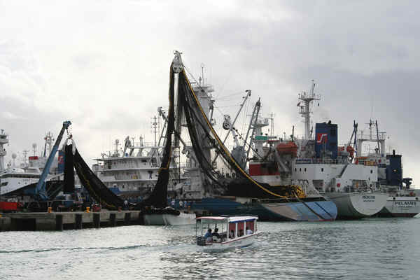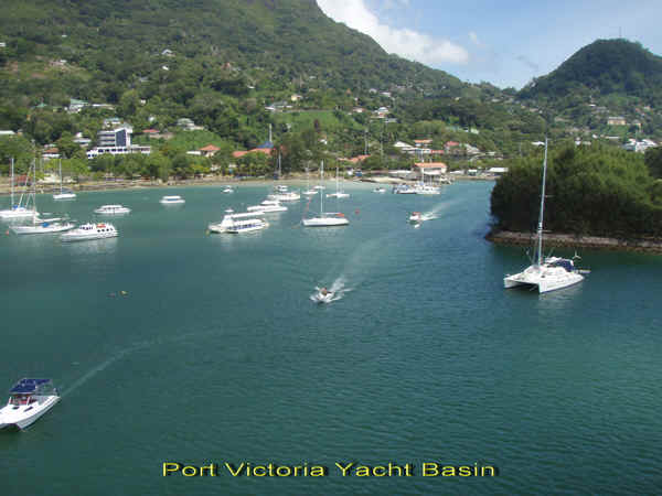 harbor, which they now call Yacht Basin. It may be hard to find this basin, as right outside freighters and packs of huge trawlers are parked densely, often hiding the entrance. Port Victoria is a very busy place where most fishing fleets from all over the Indian Ocean call, to unload tuna to one of the biggest fish processing plants in the world. Also