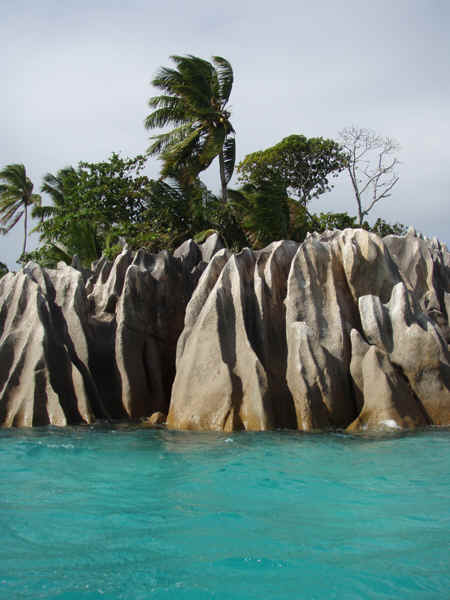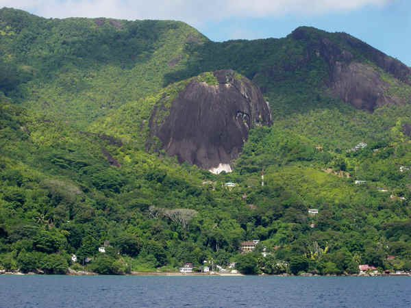 visitor instantly feels the imminent oppression by the regime. So when sailing in the Seychelles, Victoria is the place to occasionally return to for topping up with fresh produce and many other niceties. Still, while you can get everything here, you cannot all the time and if you see something good, do buy it as on your next visit it will most likely not be available. Then of course, Victoria is just one aspect of the Seychelles and there are many other very pretty places to visit by boat. After coming from Chagos, it was a tough call for any place to impress us and with respect to the under water world we now seem indeed spoiled forever. But above the water, the Seychelles are a different story, not the typical tropical Motu, flat and full of palm trees, but rather nice green mountains with impressive rock structures: Unlike almost all other small islands, the Seychelles are of solid granite. These