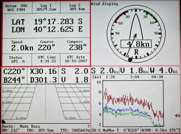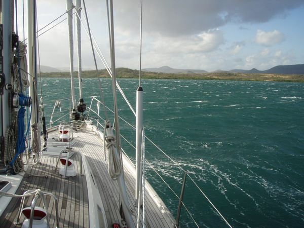 We finally decided to try to make it to Richardsbay as fast as possible and revert to the close to shore version if needed. So we stood in the current, reefed the sails enough to deal with the expected squalls, but ride the still increasing NE as good as possible, and we added the engine to make good for the somewhat conservative sail surface. That way we were now doing 9 knots through the water and 14 knots over ground. As requested we checked in with Richardsbay every half hour, giving position and distance left. And every time the tower told us, keep going, we still have northeast here.